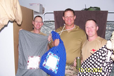 I have seen lots of soldiers around with your quilts. They are absolutely fantastic!! My boss is XXXXXXX and he is very jealous of his room mates quilts. He urged me to write to you and kindly ask if we could both have one? I am constantly blown away by the kindness of groups such as yours, who without doubt bring a great deal of morale to the soldiers here. These quilts are treasured by even the toughest soldiers!