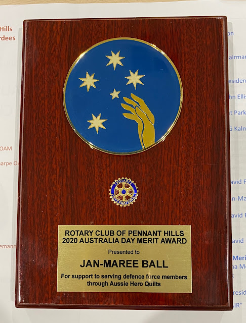 Tonight I had the privilege of speaking at the Rotary Club of Pennant Hills Australia Day Celebration Dinner. After a lovely meal I was invited to take the microphone and tell the Aussie Hero Quilts story. Aided by Bev F who controlled the Powerpoint for me I spoke for about half an hour and then whilst Bev held them up I spoke about several of our quilts and laundry bags. My presentation was well received and then the program moved on to the last formality of the night, the introduction and presentation of the 2020 Australia Day Merit Award.