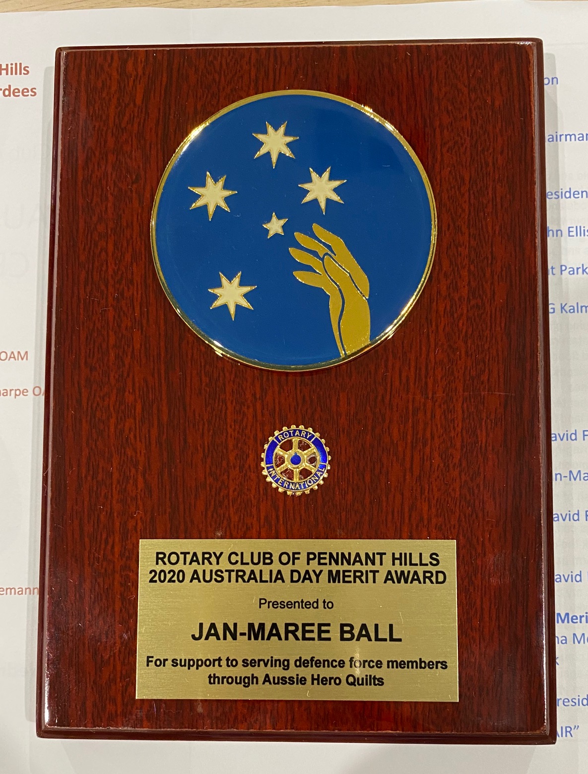 Tonight I had the privilege of speaking at the Rotary Club of Pennant Hills Australia Day Celebration Dinner. After a lovely meal I was invited to take the microphone and tell the Aussie Hero Quilts story. Aided by Bev F who controlled the Powerpoint for me I spoke for about half an hour and then whilst Bev held them up I spoke about several of our quilts and laundry bags. My presentation was well received and then the program moved on to the last formality of the night, the introduction and presentation of the 2020 Australia Day Merit Award.