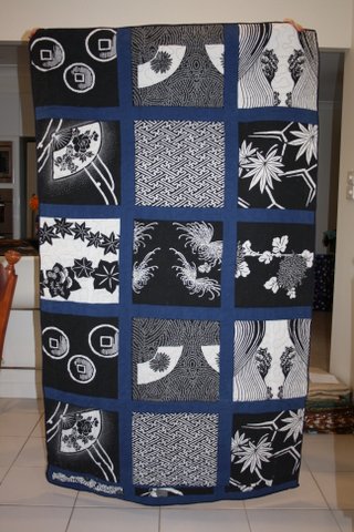 What a hectic busy day!  Bev F, Bev U, Gail, Joan Mck and Bridget all descended on my home at ten this morning and as usual the day started with a briefing around my kitchen table.  Parcels were opened and photographed and contents put away.   Gail brought a box of fabric from Kay that needed to be sorted.  Everyone brought something with them; a completed project from the sewing day for example.