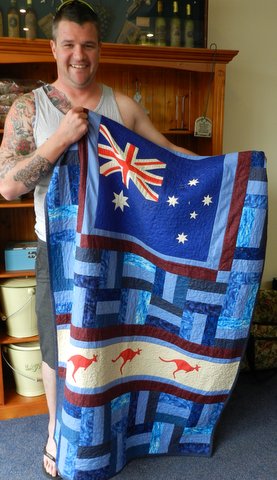 This is Chelly’s first official Aussie Hero Quilt. She chose the fabric and pieced this top at the last sewing day and then Carolyn offered to quilt it for her. Chelly got a surprise today when Carolyn dropped in especially to return the quilt to her so that it could have the binding sewn on it today.