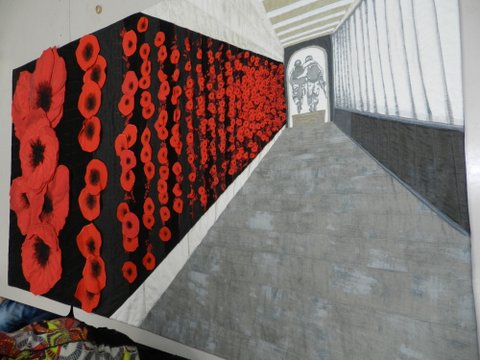 These big poppies are amazing. These are maybe a generous dinner plate size and the poppies closer to the archway at the other end are down to less than a centimeter in size! The perspective on this quilt is just perfect!!!