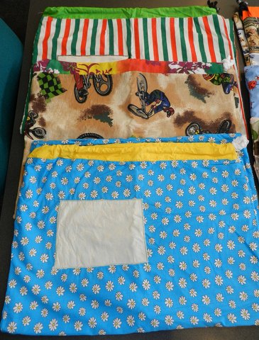 Last time we met at Penrith Katherine came along and asked lots of questions so that she knew what we needed and what we were doing. She went home and started sorting fabric and has already made and sent off her first quilt. Today she brought along several laundry bags she has made so I could see them.