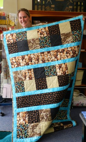 Oh, and Chelly’s gorgeous, recently-returned-from-deployment husband dropped in today. He is such a good sport for doing so. He brought his quilt along and was kind enough to pose with it for a photo so that I could send it to his quilter, Liz.