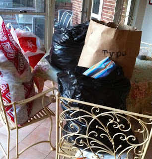 And Jennie did not come empty handed. She brought me four HUGE bags of fabric from her stash to donate to Aussie Heroes and see that TYPO BAG?