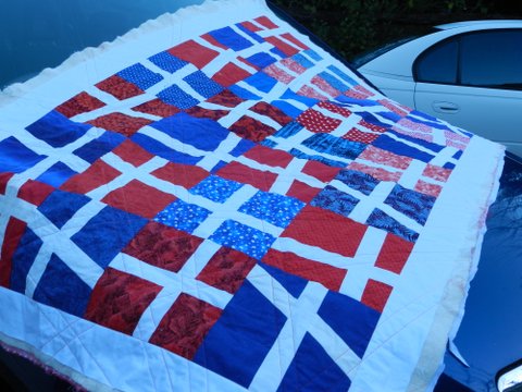 This is the other April BOM quilt. I actually took it outside this afternoon to lay it on my colour coordinated royal blue car but the light wasn’t great. Probably better than it would have been inside though. I have quilted it is wonky lines –
