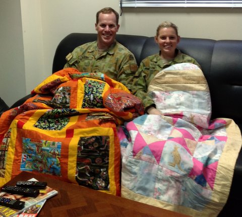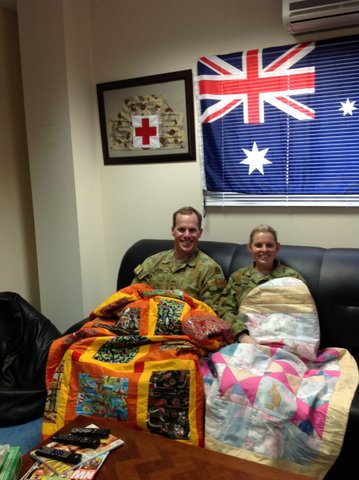 I have attached a photo of myself (on the right) and my colleague (whose quilt was made by Maddy) with our Aussie Hero Quilts. He received his not long ago and we now both have them on our beds here – it really helps to personalise your space.