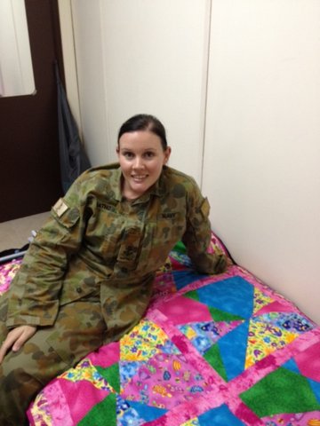It is definately something I will treasure always!! Thankyou so much for all that you do for our troops you really have put a smile on mine and many other faces around the camp, not to mention it has brightened up my incredibly plain bed 🙂 Thankyou for giving us all a touch of home to take with us along our travels we all do truly appreciated the time and effort you all put into the quilts and wash bags for us all 🙂