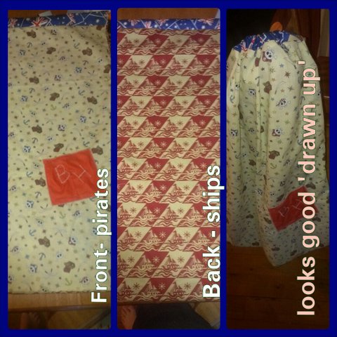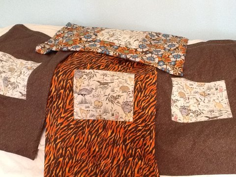 Note – Fabric is plain homespun discharge dyed with bleach and Judy has stencilled the features on them.