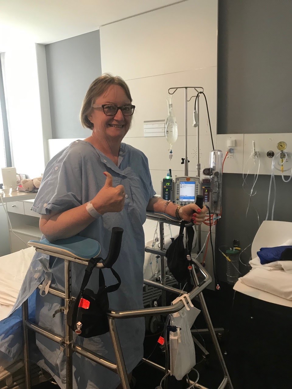Just wanted to provide another update on Jan-Maree. She had a rough night last night due to the pain – and the nurses were a little slow in escalating to the surgeon. Finally got some stronger pain medication around midnight and got some sleep from 2AM. They moved her out of intensive care this morning into a standard room so we were able to get her setup and unpacked properly – so now her new quilt is proudly on display! The physio team have been in late this morning and got her standing.
