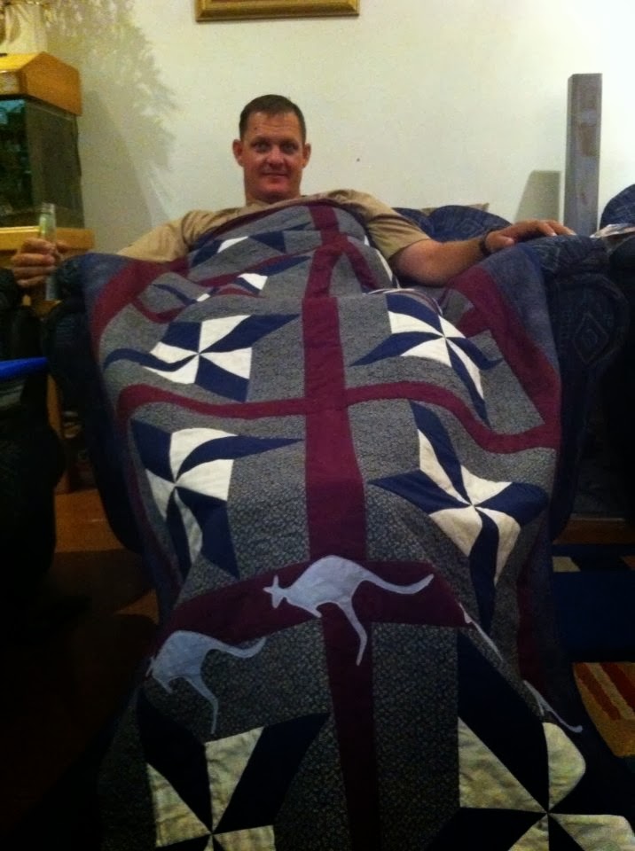 I can’t tell the story without showing you a photo of the quilt that Liz made proudly displayed whilst he was deployed.