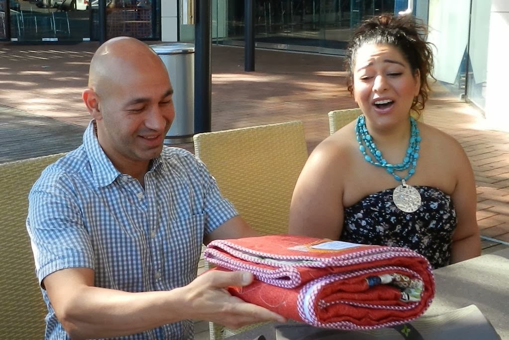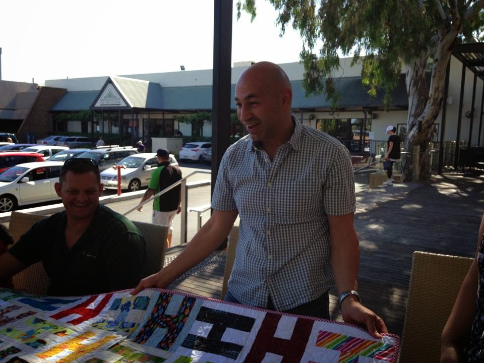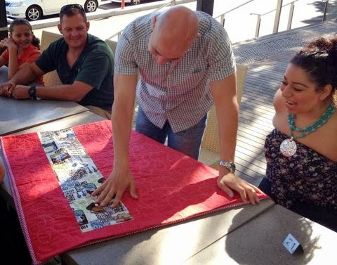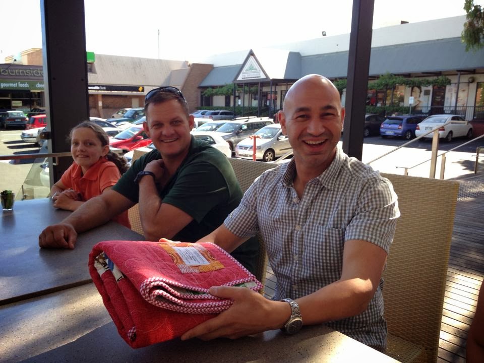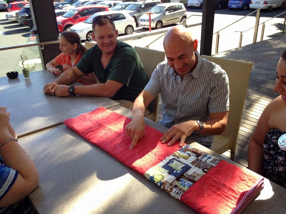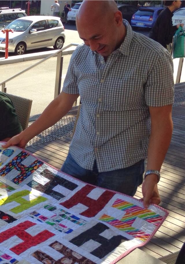 On Saturday morning Paul, Amanda, the children and I went off to meet H and his lovely sister, Sofi, and her husband, Peter, for brunch at the Cafe that H owns with his cousin. What a treat, after leaving cold, grey drizzly Sydney to sit outside the cafe in the dappled shade and enjoy some yummy food. Before we ate I presented H with his quilt. For those of you who are not familiar, last year I called for blocks in the shape of an H. It was one of our Mystery Quilts and blocks came in from all over the country as often happens with Mystery Quilts. Once all the blocks were in I sent them down to Lynn and she made the quilt top. I found some red fabric covered in letters and spliced in some cafe themed fabric to create the backing and sent to the lot up to Kym in Bundaberg who quilted it. (more on that later)