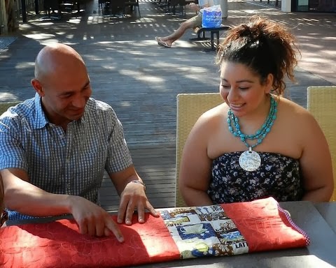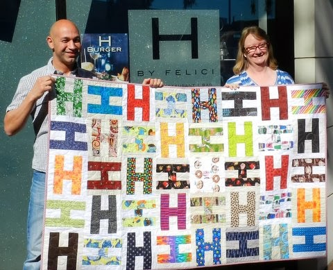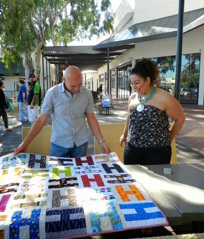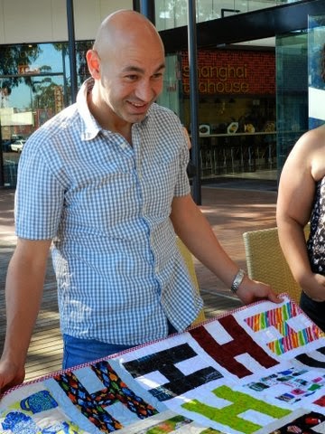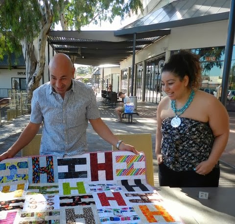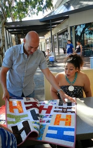 On Saturday morning Paul, Amanda, the children and I went off to meet H and his lovely sister, Sofi, and her husband, Peter, for brunch at the Cafe that H owns with his cousin. What a treat, after leaving cold, grey drizzly Sydney to sit outside the cafe in the dappled shade and enjoy some yummy food. Before we ate I presented H with his quilt. For those of you who are not familiar, last year I called for blocks in the shape of an H. It was one of our Mystery Quilts and blocks came in from all over the country as often happens with Mystery Quilts. Once all the blocks were in I sent them down to Lynn and she made the quilt top. I found some red fabric covered in letters and spliced in some cafe themed fabric to create the backing and sent to the lot up to Kym in Bundaberg who quilted it. (more on that later)