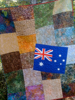 SPECIAL QUILTS: A lovely chocolate-y masculine quilt by Nadene from WA was the 16th AH Quilt (out of a hoped for 25) to go to Egypt. The pattern is a fabulous way to stretch your stash of expensive Aussie fabrics. The Aussie fabric squares are 5 1/2″ and the sashing strips are 2 1/2″ making the resulting squares 36″. The borders are about 3″. Of course you could vary the sizes with each quilt depending on what fabrics you have to work with. Great job Nadene!!! – from Jan-Maree