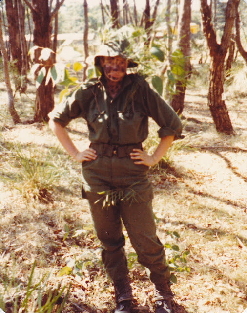 I suppose I should start by telling you a little about myself.  Have a giggle – you won’t be able to tell, but this is me, aged 19, on Bivouac for my Junior Officer Introductory Course in the early 80′.  No, I had not just had my face shoved into a plate of vegemite toast – that was camoflage paint and perfectly applied I had thought at the time! LOL Can you see that we still wore gaters back then, strapped over the legs of our jungle green trousers.