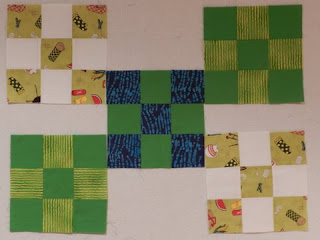 So, that was the mail out and this is the mail in. This first lot is from Pauline. First her 9 patch blocks – lovely and bright and just what we need.