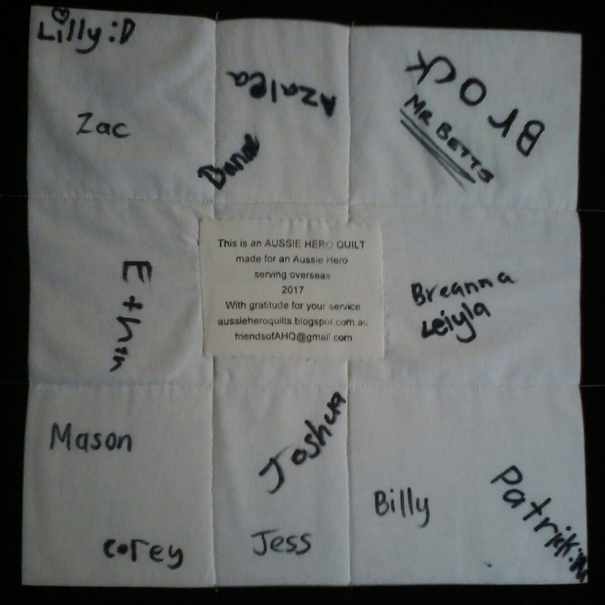 Firstly thank you to yourself and the class of 3/4B for the amazing quilt. I am nearing the end of my deployment now and just received your care package and quilt. I also read through all the letters and cards that the class sent me. The coloured in pictures are now stuck up on the inside of my locker.