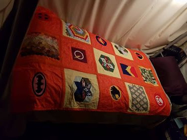 “Hi Jan! Even though I have letters on the way to the wonderful ladies who made my quilt and laundry bag I wanted to share a picture with your community as the making of my quilt was shared here and I thought you’d all (especially Joy) like to know it is really truly appreciated, especially now its cooling down overnight. Also it is an exciting time when any of us receive packages marked with your name and they tend to draw a crowd. Safe to say we are all impressed and awed with what this talented group of ladies can create.