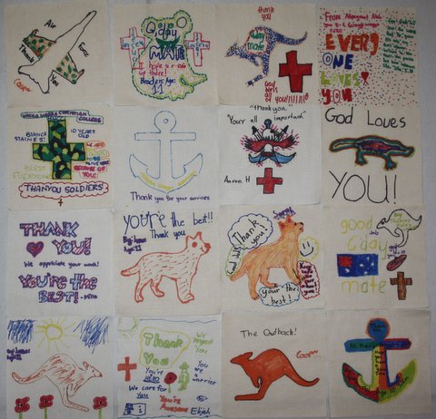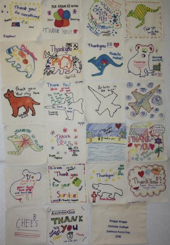 A couple of weeks ago I was delighted to be invited to take part in the Defence Force Day at the Wagga Christian College. Children from Years 5 to 8 were exposed to various aspects of service life from drill, to PT and much more. Aussie Heroes was invited to come along to talk to the children about how we support our troops whilst on deployment. I have each class a run down on what we do and why and then asked each student to decorate a square of calico.