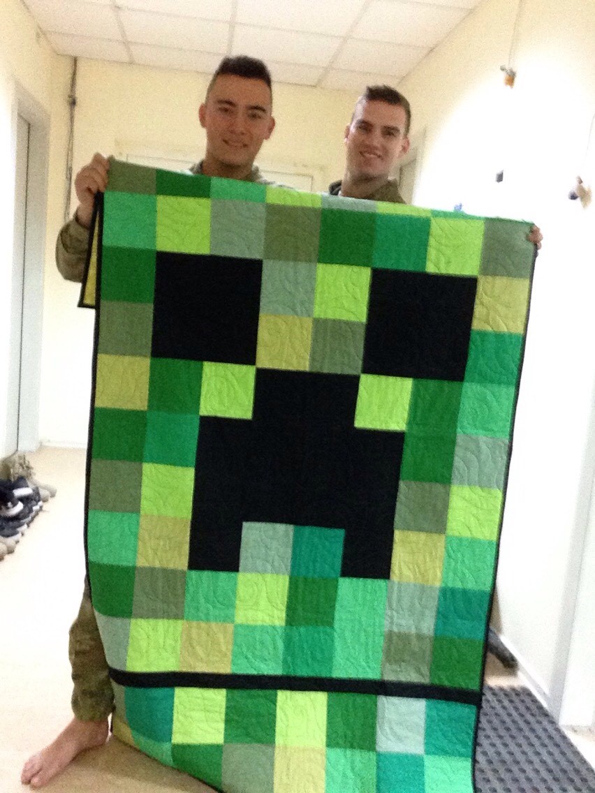 I just received my mine craft Aussie quilt! I have to say it looks amazing and will cherish it for a long time to come. As you personally requested to make my quilt I would like to personally thank you for doing an outstanding job! Although I know you don’t expect thanks and praise for doing a good deed please know that everyone who has received a quilt from you and the organisation is extremely grateful! Please say hello to your husband Peter and your two grandchildren who were the inspiration for my creeper quilt.