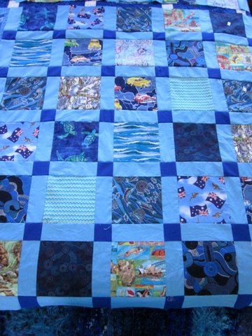 I have hardly done any sewing this week but as I have been waiting for some of my recipients to receive their goodies I can now show you some that I “prepared earlier”.  This first one is a bit special.  My son has recently moved schools for Year 11 and 12 but the small group leader from his last school is such a lovely man that we have kept in touch with him.  His name is Gordon and he told me about a past student of his (lots of people keep in touch with Gordon) who will be deploying at the end of the month.  I will call him Jim.  Well Jim received the laundry bag I made for the Australia Day Challenge and I might add is already using it and is receiving numerous “Who made that for you?” comments.  Then it was time for his quilt.  I made the quilt top and sent it to the wonderful Belinda to quilt it. I had promised Gordon that once the quilt was finished I would show him and Jim’s Sydney based parents.  Last Sunday was the day and I joined Gordon at Jim’s parent’s home for afternoon tea.  I only found out a few days before that Jim, his lovely partner and their gorgeous little one would be there too.