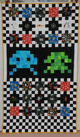 And this one is a joint effort – the Space Invader blocks were made by Stephanie D, the embroideries were made by Michele and the quilt top was pieced by Louise and then quilted and bound by Carol!