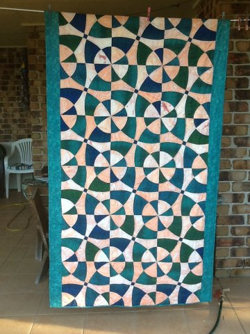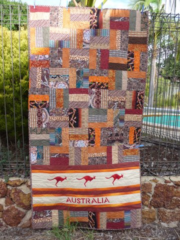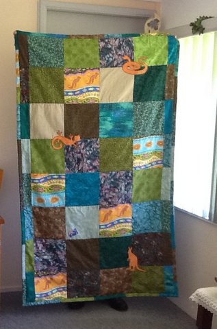 I have hardly done any sewing this week but as I have been waiting for some of my recipients to receive their goodies I can now show you some that I “prepared earlier”. This first one is a bit special. My son has recently moved schools for Year 11 and 12 but the small group leader from his last school is such a lovely man that we have kept in touch with him. His name is Gordon and he told me about a past student of his (lots of people keep in touch with Gordon) who will be deploying at the end of the month. I will call him Jim. Well Jim received the laundry bag I made for the Australia Day Challenge and I might add is already using it and is receiving numerous “Who made that for you?” comments. Then it was time for his quilt. I made the quilt top and sent it to the wonderful Belinda to quilt it. I had promised Gordon that once the quilt was finished I would show him and Jim’s Sydney based parents. Last Sunday was the day and I joined Gordon at Jim’s parent’s home for afternoon tea. I only found out a few days before that Jim, his lovely partner and their gorgeous little one would be there too.