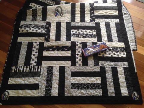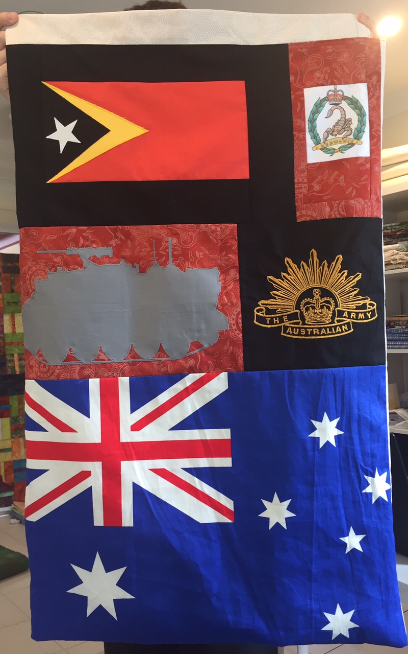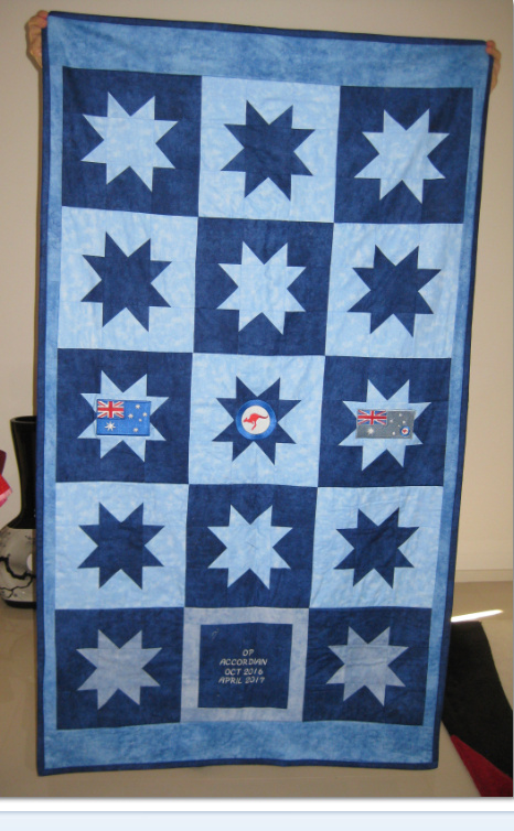 For those who do not know here, she returned from deployment to Kabul about 12 months ago and very quickly got involved with us after having received her own quilts and laundry bag whilst deployed. She was one of the team that helped to get Aussie Hero back up and running, helping out at Government House and the Stitches and Craft Fair. She has sewn quilts and laundry bags and done more.