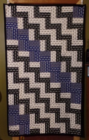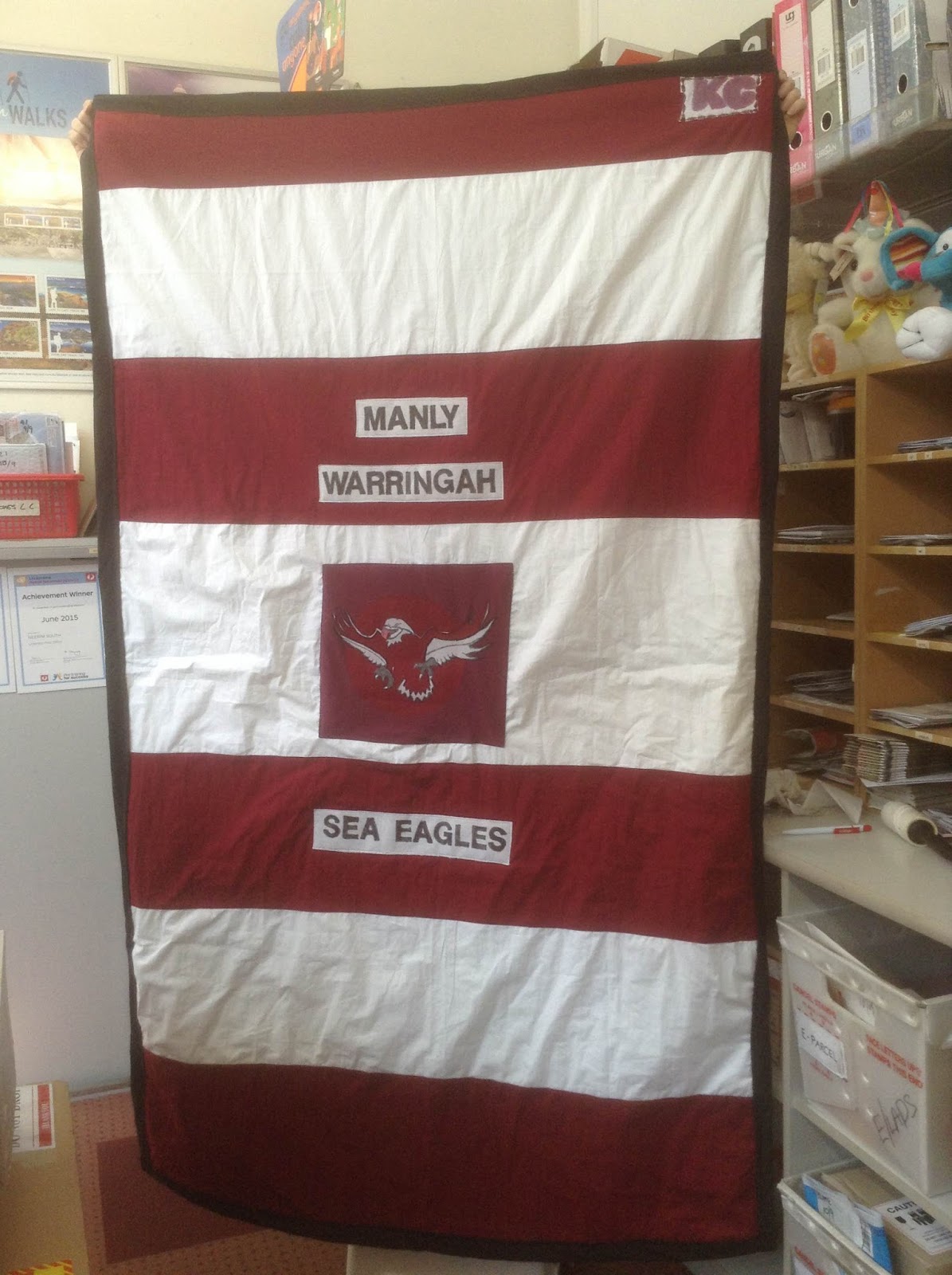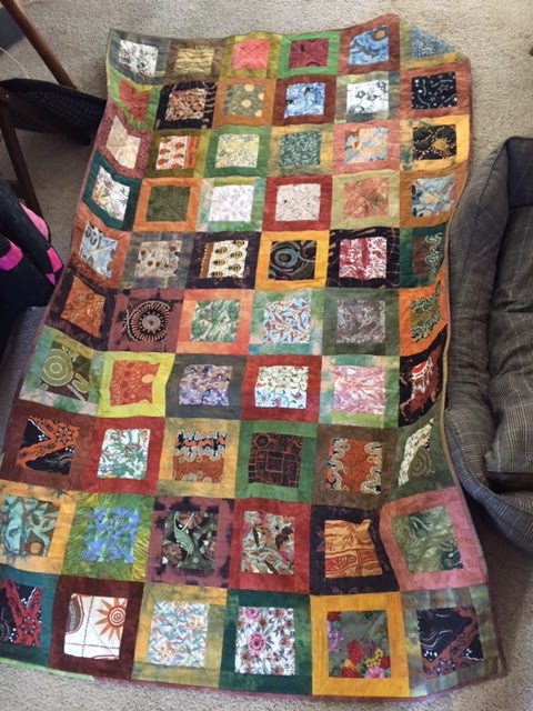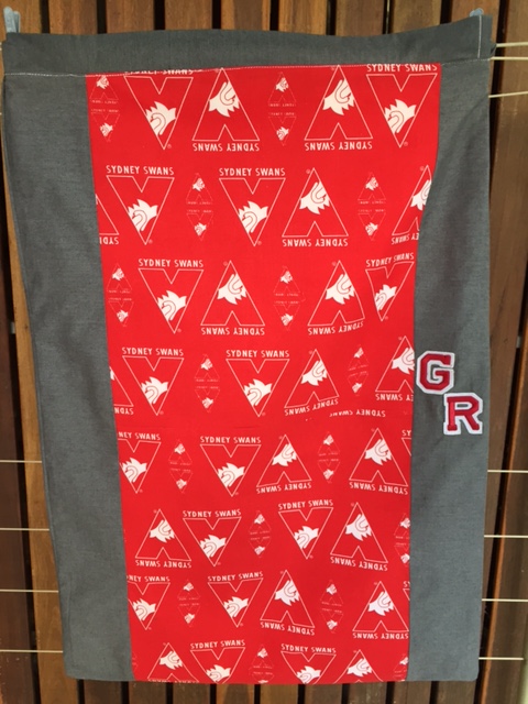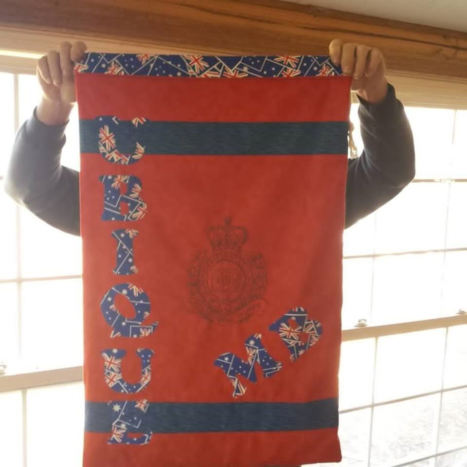 This was a bit of a joint effort. I created all the letters but had to hand over to Lynn to do the applique and put the quilt top together. Maureen embroidered the badge at the bottom by hand. Kerrie embroidered the Skippy badge on her machine and Lisa N quilted and bound it and sent it off.