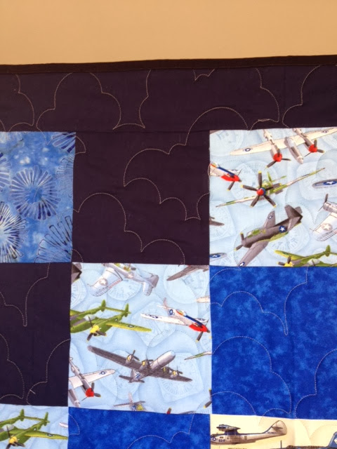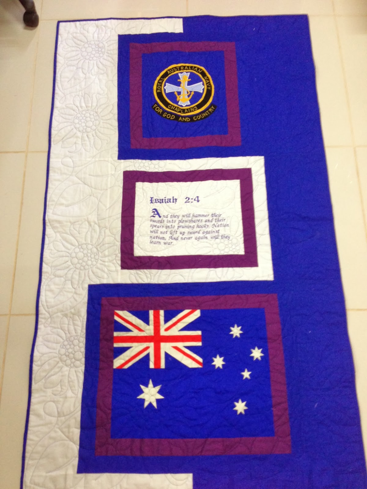 Embroidery by Michele, navy chaplain’s crest by me, top pieced by Lynn (who has completed 100 quilt tops!!!) and quilted all over with sunflowers by Kym!