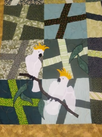 Well okay, maybe it is.  This quilt top is the result of a joint effort.  Dasha decided to clean out her stash of greens and made all the wonky blocks, which she was not that keen on as she is not a fan of the wonkiness!    I suggested that she put them together in the one top at a sewing day and include an Aussie block as well.  Once completed I felt it had a real Aussie look but did not that time to think about it any more before sending it up to Debbie.  Thankfully Debbie argreed and asked if she could applique it and look at the results!  LOVE IT!