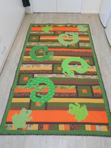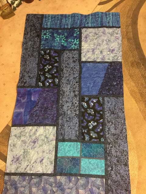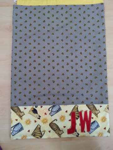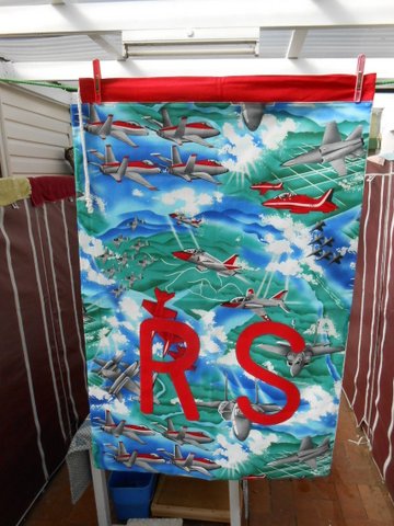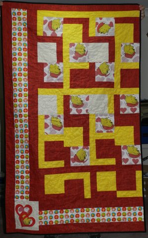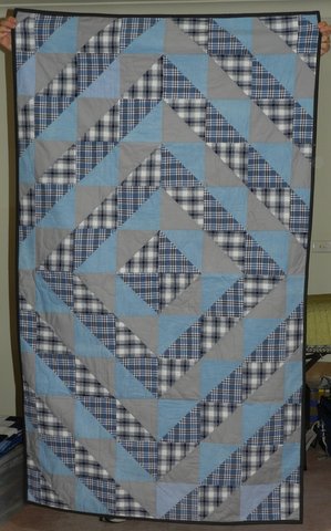 This is a donated quilt top that turned out to be JUST PERFECT for this recipient… I just wish I knew who made the top. It was quilted by Cath M and embellished with the feather by Cheryl R. And before anyone tells me, yes, I know what a white feather strands for and the recipient specifically requested it….. 🙂