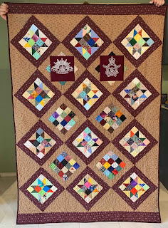 Q Clarissa with donated blocks, Emb by Clarissa, quilting by Philomena