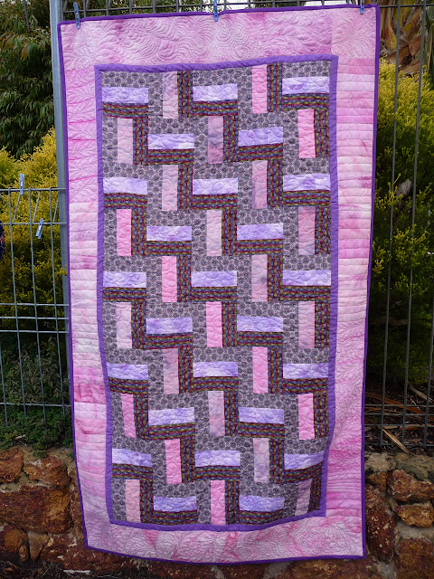 Kylie sent in these lvely wonky nine patch blocks as blocks of the month. Gail took them home and brought back this great quilt top. Check out the quilting that Kym has done! AWESOME
