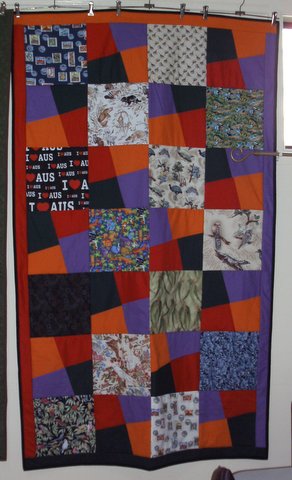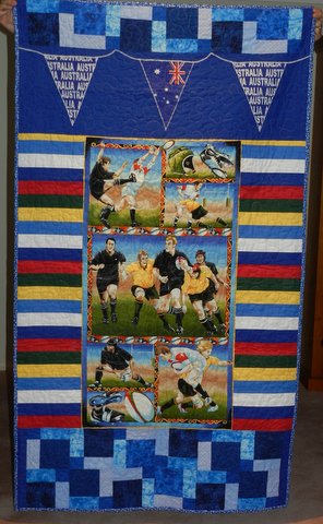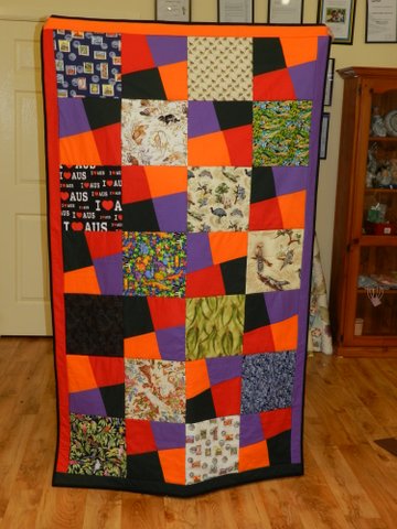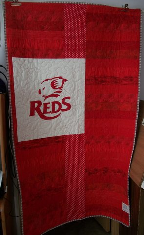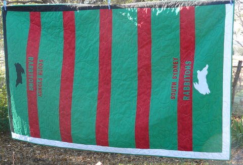 This is a joint effort.  I cut the strips and added them to some of the BOM strips. Carolyn sewed them together at a sewing day in Penrith and then I added the Bulldogs logo.  Liz B then quilted it and sent it off.