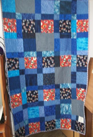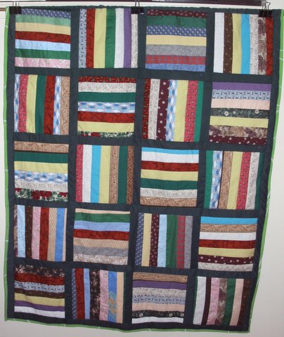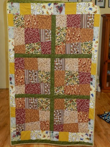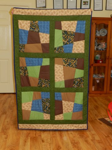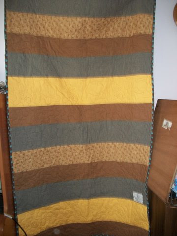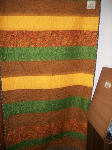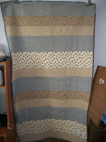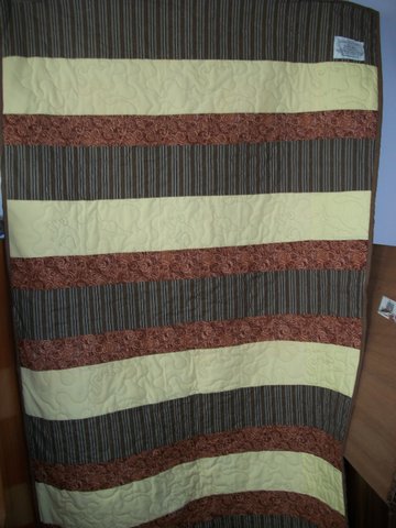 Now this is  a special quilt made by 8 year Georgia under the supervision of Gail, her grandmother. It is her first sewing, and she wanted to do it “for a soldier”. Wow.  Georgia did all the piecing, and all that lovely straight line quilting as well.  Gail finished with some stippling on the shorter side pieces,  and did the hand sewing of the binding. I have selected a special recipient for this one.