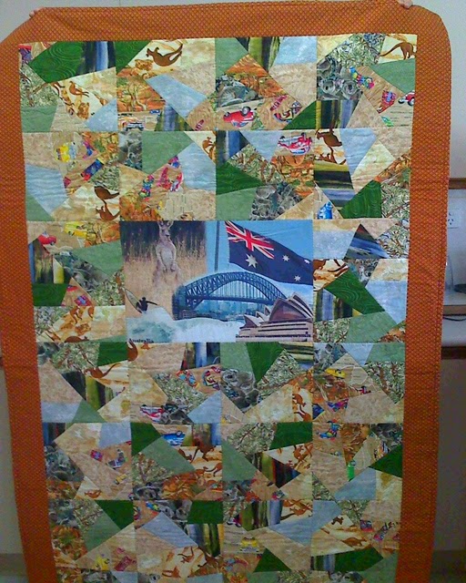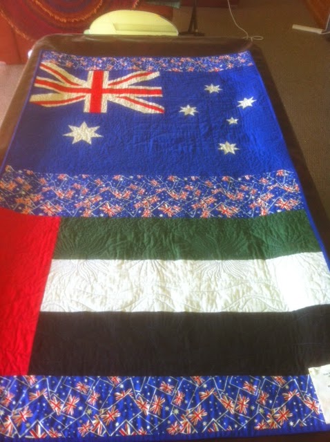I also had a lovely surprise when another woman, who knew I was going to be there brought me her son-in-law’s quilt to use during my presentation – see below. She said he let her borrow it to show me but then it had to go back so he could put it bag in his swag which goes with him every deployment. Big thanks to him for letting her bring it for me.