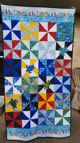 In the past couple of years we have donated many quilts, made 24 turbans for breast cancer patients, 350 placemats as Christmas gifts for clients of our local Meals on Wheels, 45 bedrunners for extension of a Nursing Home, and each year have an Art Union. The proceeds of our 2016 Art Union resulted in over $7000 given to our local Hospice. This year, proceeds of our Art Union will go to Smart Pups, to support training of Labrador puppies to assist children with disabilities.