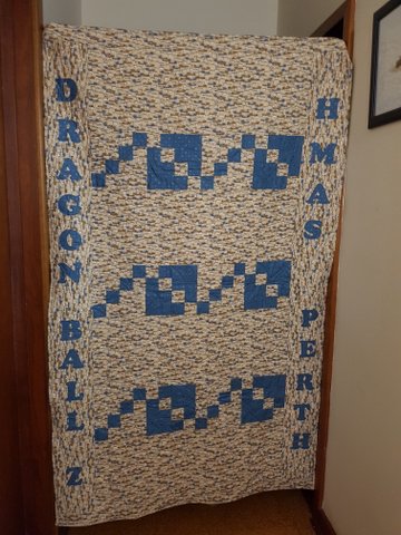 I am glad to say that the chaplain was not the only one with surprises.  I had also carried a parcel all the way from home …. obviously not as far as the Padre had but still…..  I was able to present this wonderful quilt made by Lisa N.   I won’t tell you too much about it as there is quite a good story about it and I want to wait till I have all the details to go along with it. A couple of weeks and I will write a good post about it.  Suffice to say though, that Padre Andrew had quite a grin on his face about it!  Job well done Lisa!!!  Oh, and he loved the other goodies you included too!