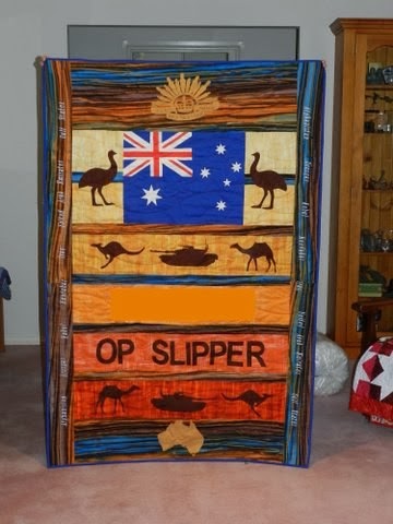 You can’t read the wording down the sides which was done by Michele but the intel shared with me about this long term serving member enabled me to include all the places he has deployed overseas throughout his career.   PLEASE note – we cannot always do this for everyone but we do try out hardest!  Not every quilter has the assistance of a wonderful lady who owns an wizz bang embroidery machine like Michele.  I am just SUPER LUCKY!!