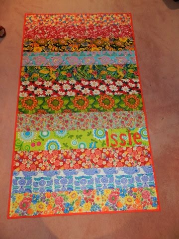 This next quilt was completed in March when we had a pot luck dinner. I asked everyone to bring a strip of bright floral fabric and during the evening we put the quilt top together. I had asked Evelyn in advance if she would applique the name on her strip and this is the result. How simple is this quilt??? And yet it is so bright and cheery, so warm and happy, and absolutely stitched with love, and it will always be one of my favourites!