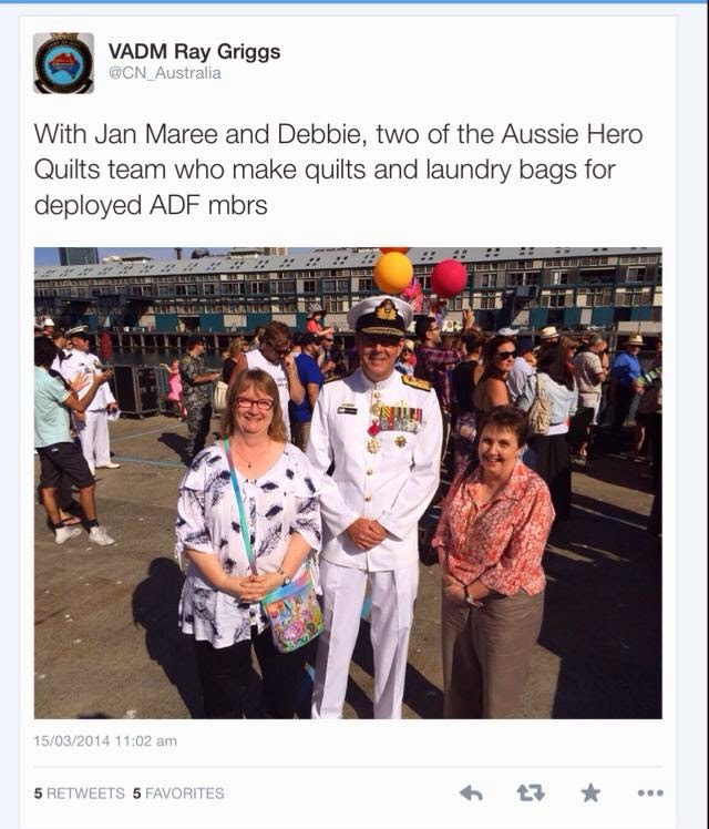 I know when I first started Aussie Heroes I knew what we were doing was a good thing, and I knew that it would be appreciated, but what I did not know was how much, and how deeply, our recipients would feel about what we do. I have to admit that I feel a bit uncomfortable trying to explain it as it feels somewhat immodest to try and describe it, but every time I talk to someone who I meet who has received a quilt or a laundry bag, or who has known that their mates or family member have received one, I am always touched by their gratitude. There is a sincerity in their voice, in their eyes, that makes it clear. I know Debbie felt it on Saturday for the first time and I know it made an impression on her. I hope over time, more of you will also get the opportunity.