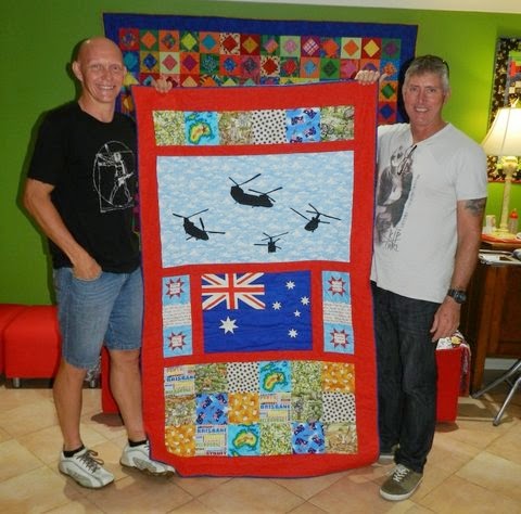 The week before they can down to Sydney these fellows were lucky enough to be in the flight pictured below. My friend in the shorts received a quilt with multiple Chinook Helicopters on it. As I once was an Air Traffic Controller I told him it was an ATC’s nightmare. This was his work day in Townsville on the 20th of June. Six CH47’s (first time all chinooks up at one time EVER). He said it was a good day for flying. Slight understatement that one.
