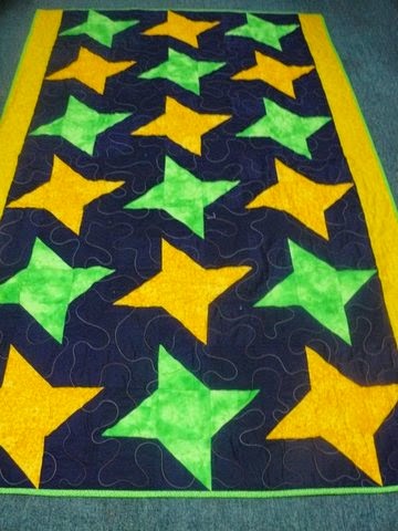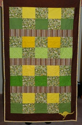 Okay, so you don’t want to do something Aussie. How about focusing on a colour. This one went off recently. There was not enough time to make this fellow a themed quilt but his favourite colour was green. He loves it I am told.