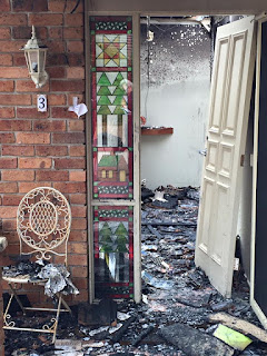 The following is JM’s paragraph about it from FB “So so grateful this stained glass window survived. I paid for it money from my mum’s estate. It is comprised of some of my favourite quilt designs, houses, trees and stars. Some of the glass came out on ships from the first fleet. It will shine again in our new house to welcome all of you wonderful people when we rebuild.”
