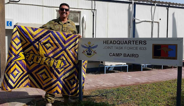 Thank you so much for the quilts you send over, particularly the quilt you kindly allowed me to nab which I think is just the most lovely quilt I have ever seen (see photo of me looking ridiculously happy with the afore mentioned quilt). Its sophistication lies in its very simplicity and I am very grateful, not only for the quilt, but also for your thoughts for all of us deployed. I have just over six weeks left of a rather long 288 day deployment (just shy of ten months) and I am looking forward to getting home, even if it is just in time for a Canberra winter!
